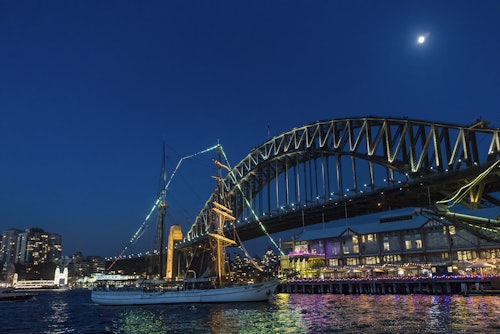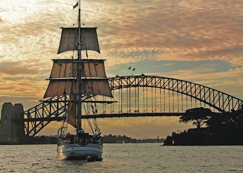 Dzięki żaglom Opery i imponującemu łukowi Harbour Bridge nabrzeże Sydney oferuje wspaniałe sceny dla wszystkich odwiedzających. Ale na pokładzie wysokiego statku czeka jeszcze bardziej niezwykłe doświadczenie. Wybierz się w rejs po starym statku przypominającym statki, które angielscy żeglarze przybyli przed wiekami, i zobacz, jak wybrzeże zmieniło się w jedno z największych spektakli współczesnego świata. Ciesz się kolacją i napojami na pokładzie, a jeśli masz dość odwagi, wejdź na maszt.